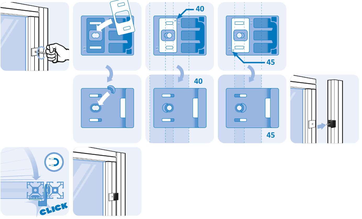 Set bestaat uit:- Deuraanslag - Plaatje - Groef fixatie- 2x Schroef ISO 7991 - M5x14- Fixatie stuk