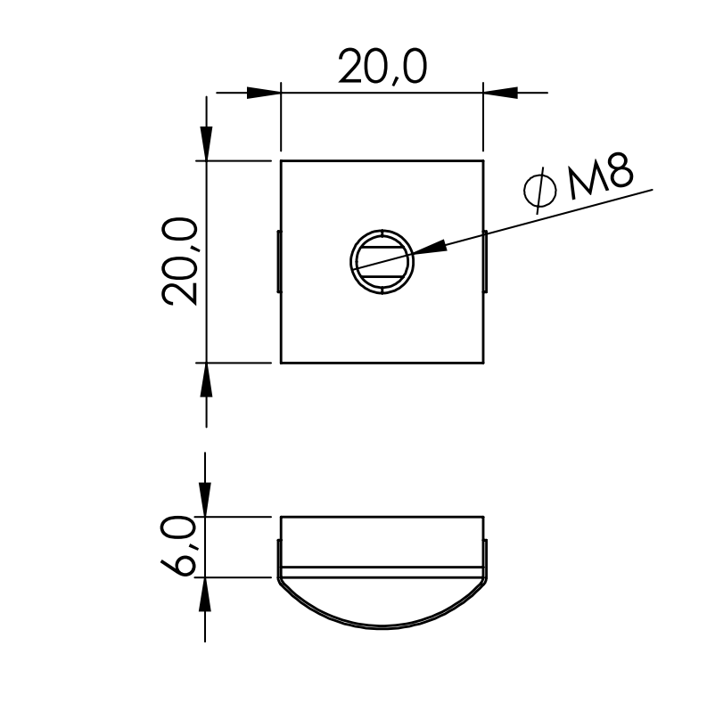 Inschruifmoer voor een E groef, voor een moer-type verbinding.
