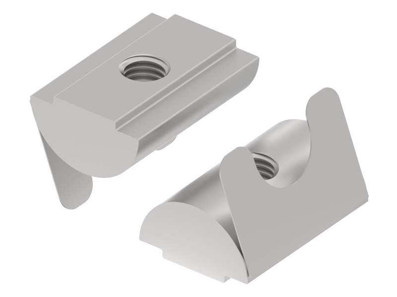 Inkantelbare schuifmoer voor een E groef, voor een moer-type verbinding.