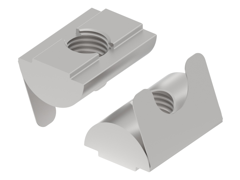 Inkantelbare schuifmoer voor een E groef, voor een moer-type verbinding.