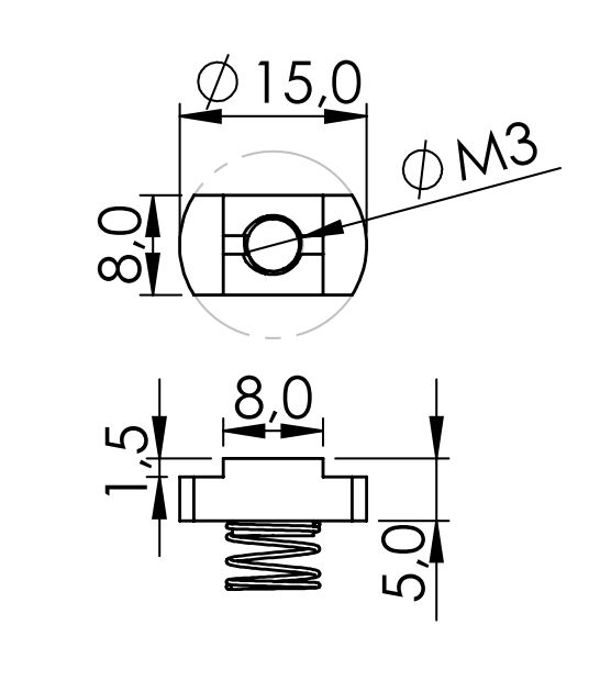 T-moer met veer voor een E groef, voor een moer-type verbinding.