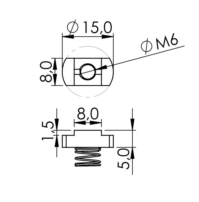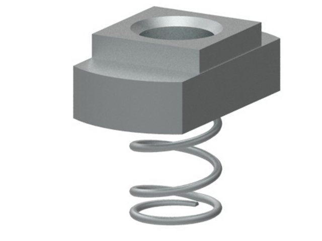 T-moer met veer voor een E groef, voor een moer-type verbinding.