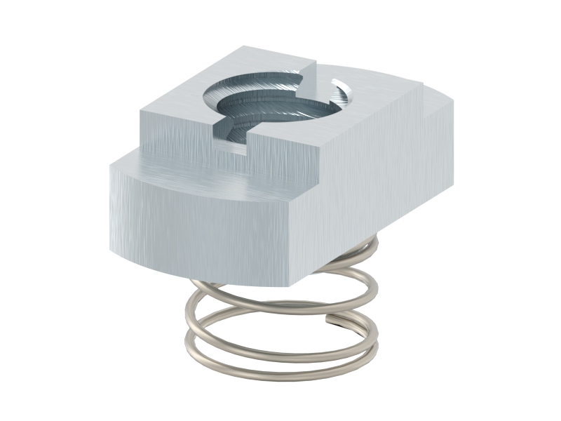 T-moer met veer voor een E groef, voor een moer-type verbinding.