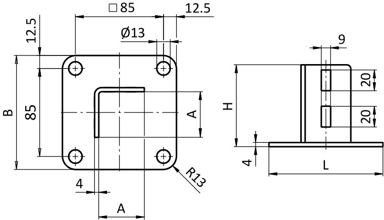 Voet console 40x40 voor het vastmaken van profielen of frames aan de grond.