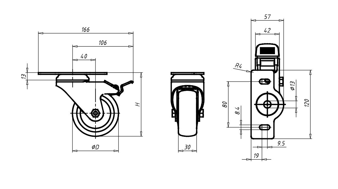 1.45.90100 - Zwenkwiel met montageplaat ø100 120kg PU