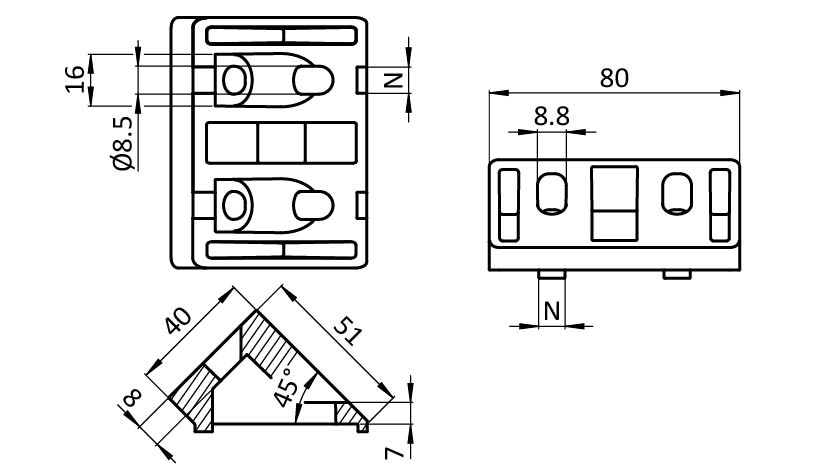 Montagehoek 45° - 40x80 - aluminium kleur
