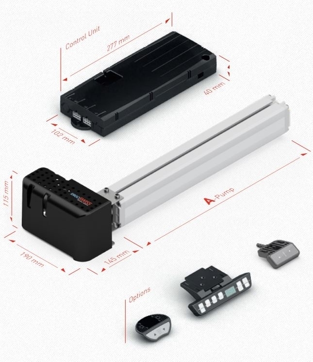 De adapter (230 VAC of 110 VAC) zit in de besturingsunit geïntegreerd. Een controlesysteem beschermt de aandrijving tegen overbelasting en dient tegelijkertijd als beveiliging tijdens ingebruikname van het systeem.