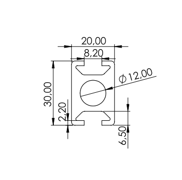 Ons 20×30 mm aluminium profiel met 2 F-groeven (8,2 mm breed) is ontworpen voor toepassingen waar extra sterkte en stabiliteit vereist zijn. De twee open groeven bevinden zich naast elkaar, wat zorgt voor een hoekvormige configuratie. De overige zijden zijn gesloten, wat het profiel een strakke uitstraling geeft en extra torsiestijfheid biedt.