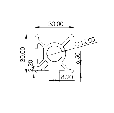 Ons 30×30 mm aluminium profiel met 2 F-groeven (8,2 mm breed) is een robuuste oplossing voor constructies waarbij kracht, stabiliteit en een verzorgde uitstraling samenkomen. De twee open groeven zijn geplaatst in een hoekvorm, terwijl de overige zijden gesloten zijn. Dit profiel heeft een karakteristieke configuratie waarbij de groeven in een hoek staan en het kwartronde deel volledig gesloten is.