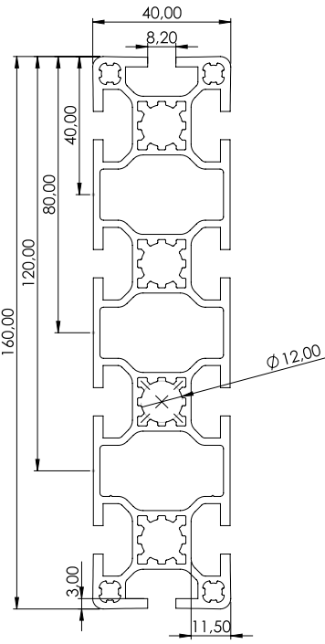 Ons 40×160 mm aluminium profielsysteem met 10 open groeven (8,2 mm breed) is ontworpen voor toepassingen die maximale montagevrijheid en structurele sterkte vereisen. Met tien open groeven verdeeld over alle zijden is dit profiel uitermate geschikt voor grote constructies, machineframes, industriële omkastingen en modulaire systemen met complexe koppelingen. De symmetrische groefverdeling maakt het mogelijk om componenten aan alle zijden te bevestigen, wat zorgt voor een hoge mate van ontwerpvrijheid en stabiliteit.