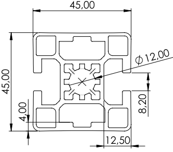 Ons 45×45 mm aluminium profielsysteem met 2 open groeven (8,2 mm breed) tegenover elkaar is een compacte en functionele oplossing voor lichte constructies. De groeven bevinden zich op tegenoverliggende zijden van het profiel, terwijl de overige zijden gesloten zijn.