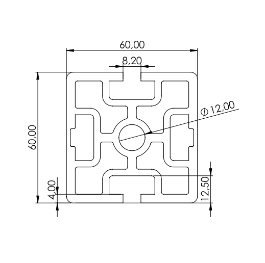 Ons 60×60 mm aluminium profielsysteem met 2 open groeven (8,2 mm breed) is ontworpen voor robuuste constructies waarbij extra sterkte en gesloten zijden gewenst zijn. De twee open groeven liggen tegenover elkaar, terwijl de andere zijden gesloten zijn. Deze configuratie biedt een goede balans tussen montagegemak en bescherming tegen vuil of beschadiging aan de gesloten zijden.