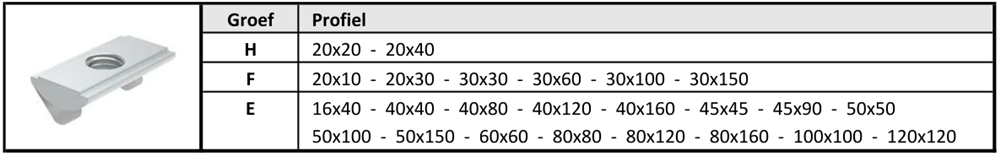 Hieronder ziet u een overzicht van de inkantelbare moeren geschikt voor het aluminium profielsysteem.