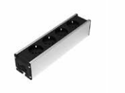 Stekkerdoos met contacten voor stroom toevoer op werkstations. Op de achterkant een mechanisme voor monteren op onze aluminium profielen.