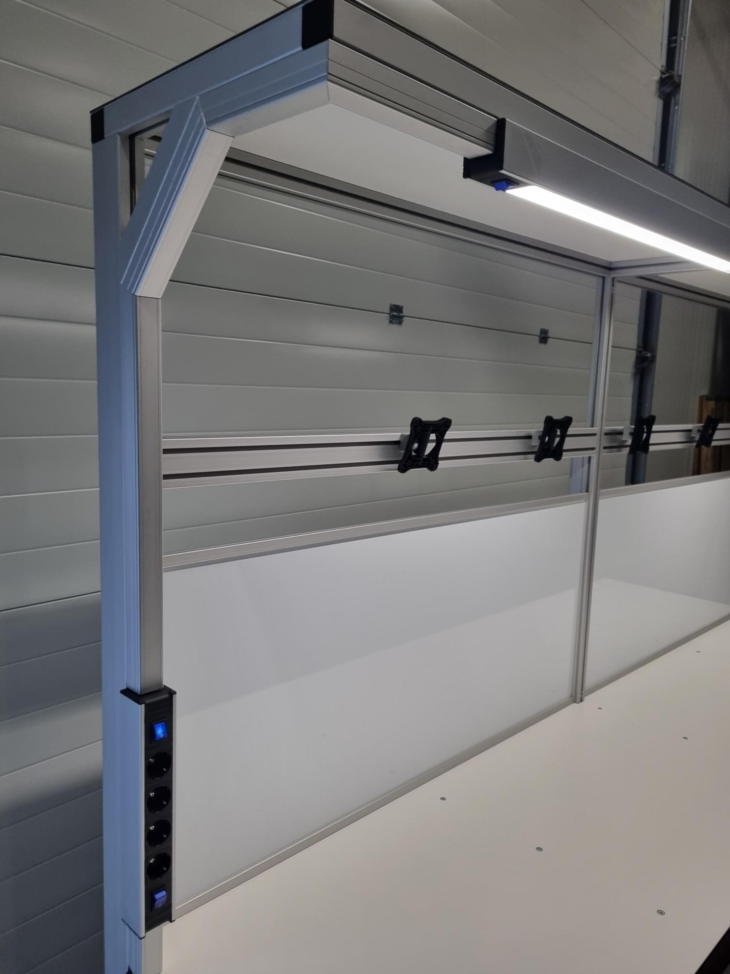Onze werktafels zijn opgebouwd uit ons hoogwaardige aluminium profielsysteem. Je kunt ze configureren met diverse materialen, zoals polycarbonaat, acrylaat, Trespa of alupanel, afhankelijk van de toepassing en werkomgeving.
